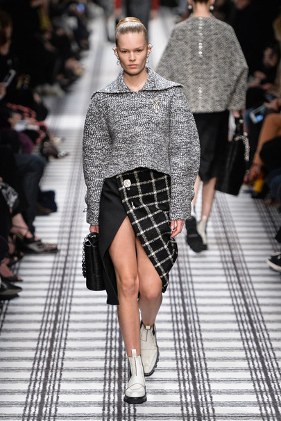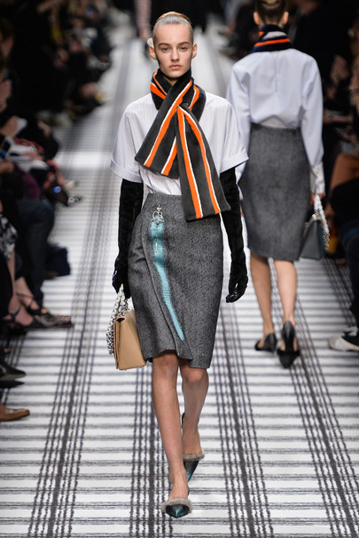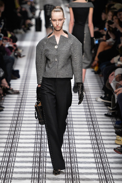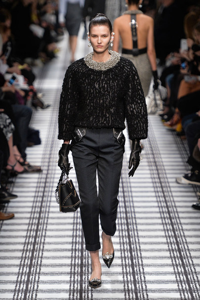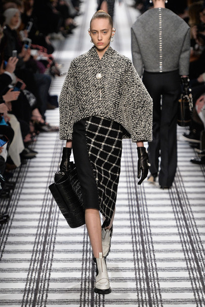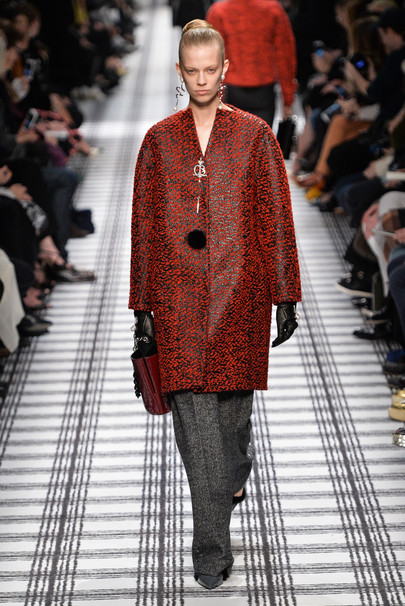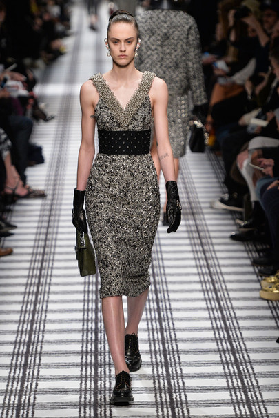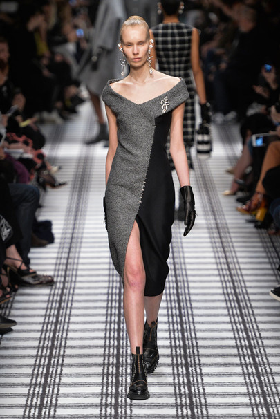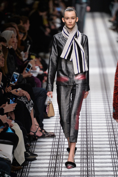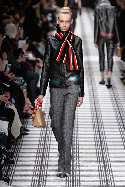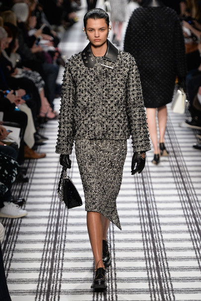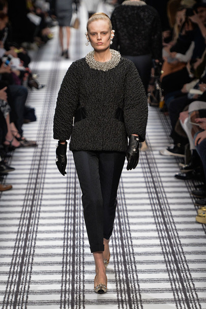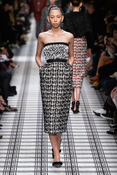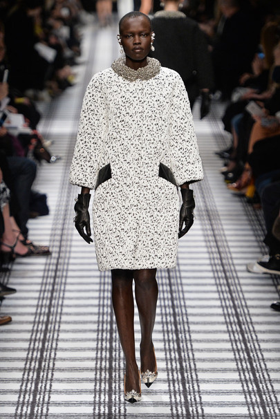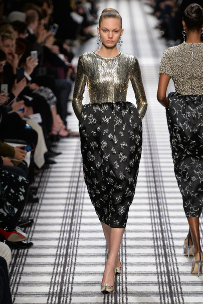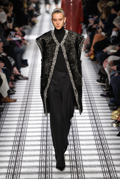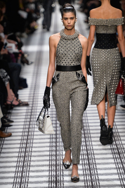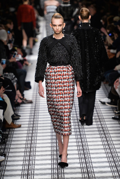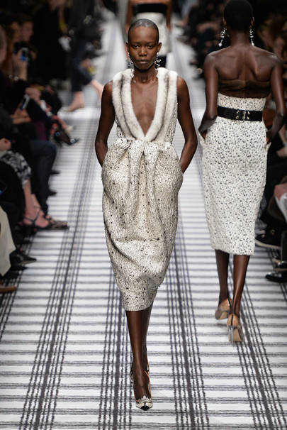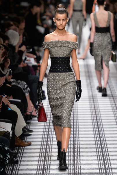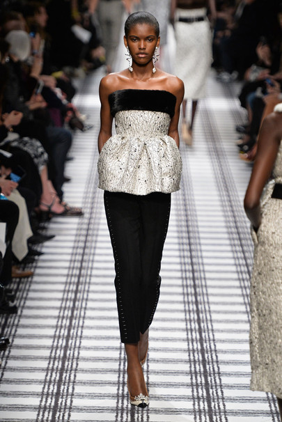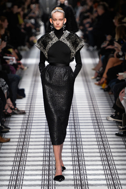 Коллекция BALENCIAGA - это мощная энергетика, пронизанная сквозь десятилетия. Кристобаль Баленсиага создавал футуристические образы, и в 2015 году на подиуме создается ощущение того, что мэтр где - то рядом подсказывает как создавать шикарные вещи. Одежда из коллекции BALENCIAGA - серая, красная, черная. Она очень изогнутая, стрктурированная.На показе в центре внимания была безусловно супермодель Алек Век.