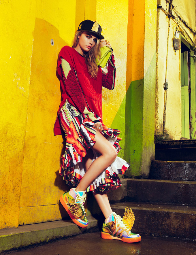 Фото Кары Делевинь для бразильского журнала VOGUE - яркие, цветные, позитивные и, в целом, классные! Здесь из одежды представлены многие дизайнеры: Карл Лагерфельд, Донателла Версаче, Сальваторе Феррагамо, Альбер Эльбаз, Стелла МакКартни, Маноло Бланик, Кристиан Лабутен, Марк Джейкобс и другие. Красивые оттенки одежды очень сочетались с большими серьгами и огромным количеством аксессуаров. Неповторимая индивидуальность Кары вновь была заметная и в этой фотосъемке.