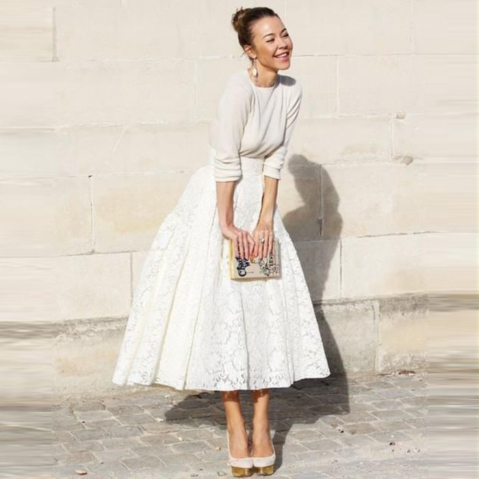 Для вечеринки вы вольны выбрать юбку миди в любом стиле. Если вам по вкусу светлый низ, попробуйте дополнить его темным верхом. В зависимости от сезона и стиля вашей юбки, можно сверху накинуть стильную и актуальную куртку-косуху или жилет из джинсовой ткани.