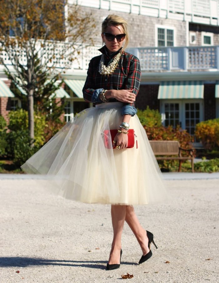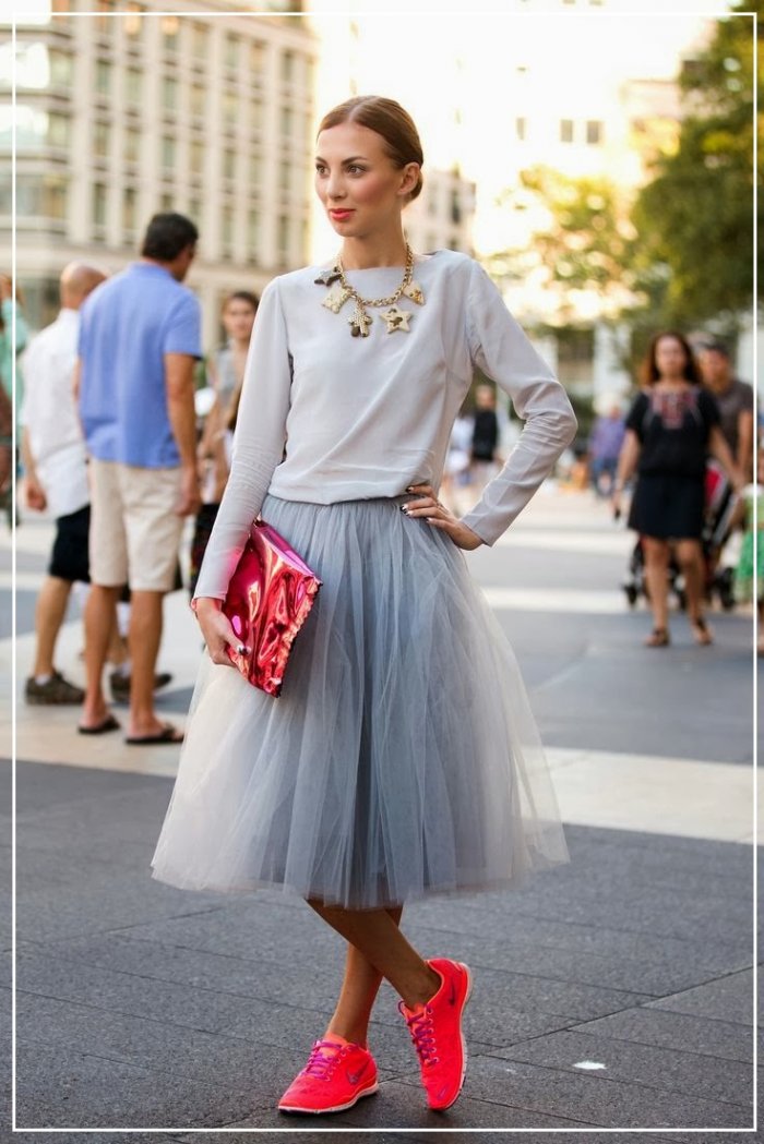 Фатиновая юбка универсальна. Конечно, привычно она смотрится в более женственном стиле, но даже кеды и свитшоты могут стать идеальным дополнением к ней. Футболки либо майки по фигуре, куртки косухи, полуспортивная обувь – прекрасное сочетание в стиле кэжуал. Отлично будет смотреться столь актуальная сейчас тельняшка. Сменив обувь на более классическую, например, туфли на шпильке, образ станет уже более женственным и романтичным. Отлично юбка будет сочетаться с рубашкой и широким ремнем. Смелые девушки могут сочетать фатиновую юбку с более тяжелой обувью, полумужскими сапогами; верх - свитшот или наоборот легкая блуза. И даже столь повседневные и любимые всеми угги можно сочетать с такой юбкой, дополнив свитером крупной вязки, и объемной сумкой. Различные аксессуары также смогут удачно дополнить образ.