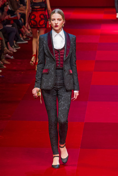 После выхода на подиум модели в черном костюме с шикарной вышивкой по ткани, в стиле лондонского денди, стало понятно – это лучшая коллекция сезона весна-лето 2015. Мужские линии в женском гардеробе по-прежнему в тренде.