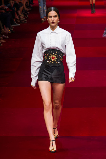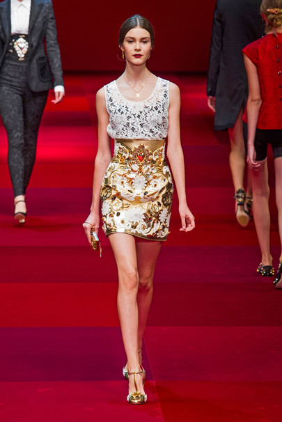 Дама в боди разгуливала по модному подиуму, словно бравый офицер армии гусаров. Как уже стало постоянным, в коллекции Dolce & Gabbana присутствуют сочетания золота и белого цвета.