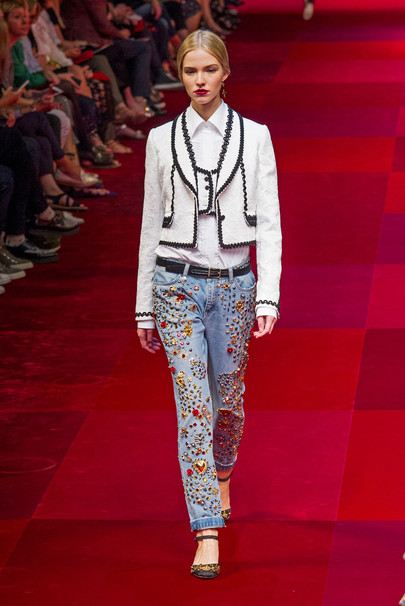 На этот раз модельеры внесли в наряды прет-а –порте джинсы мужского покроя, скинни, как их называют в модной индустрии.