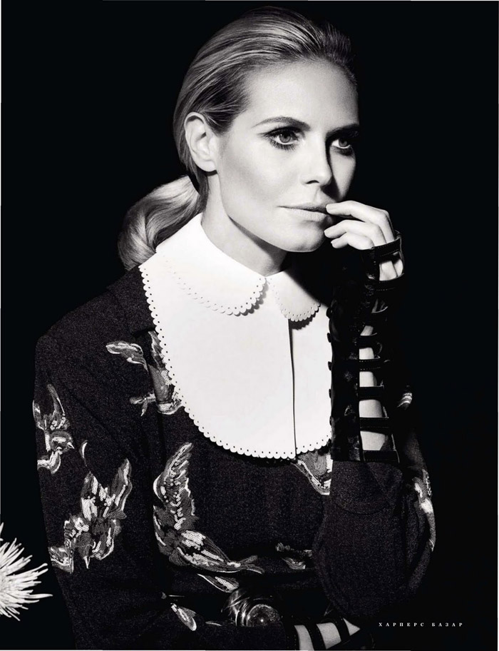 Хайди Клум для журнала Harper’s Bazaar Russia внимается довольноч асто. Она очень полюбилась российским дизайнерам и главным редакторам модных изданий. Часто супермодель 90-х и мать 4-х детей снимается обнаженной, но в данной съемке она в изысканном черном. Одежда производства Майкла Корса (кстати, в фотосессии дизайнер тоже присутствует) выглядит шикарно. Четкие линии, простые формы, активные цвета - всё в стиле американского модельера.