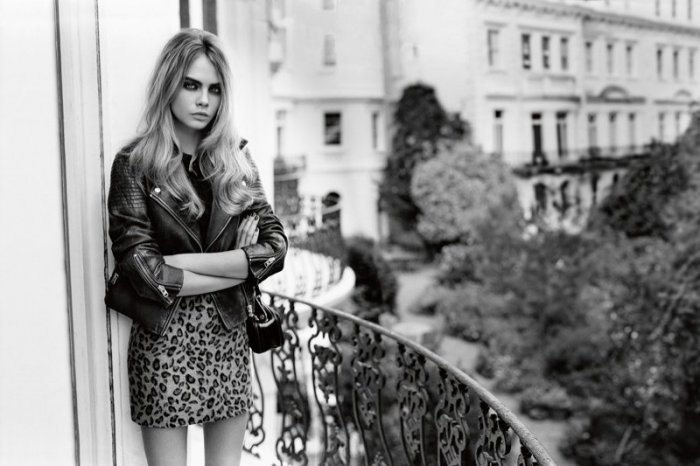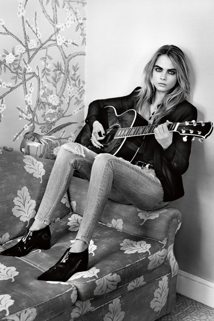 Съемки Кары Делевинь для Topshopпроходили в помещении уютного офиса. Убранство вокруг слегка напоминало о роке. Но больше о рокнролле говорил сам образ модели. Сильно накрашенные губы и выразительные глаза, подведенне черным лайнером. Небрежно разбросанные по дивану волосы. Обувь, узкие брюки, черные тона в сочетании с яркими акцентами - всё это очень запомнилось фотографу и всей съемочной группе.