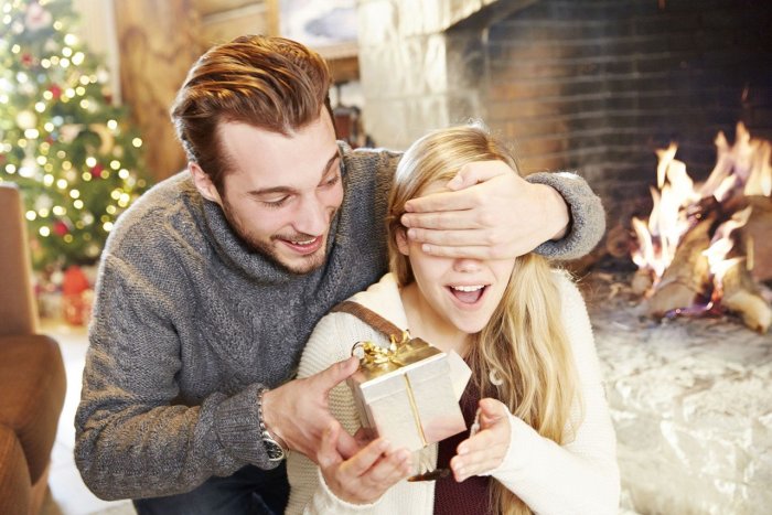 ![Девушка дарит подарок мужчине]()